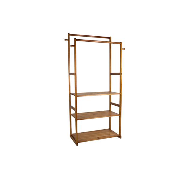 This coat rack has two coat hanger poles at the top. In the end it has four convenient hooks for towels and two bamboo shelves at the bottom. Made of bamboo.